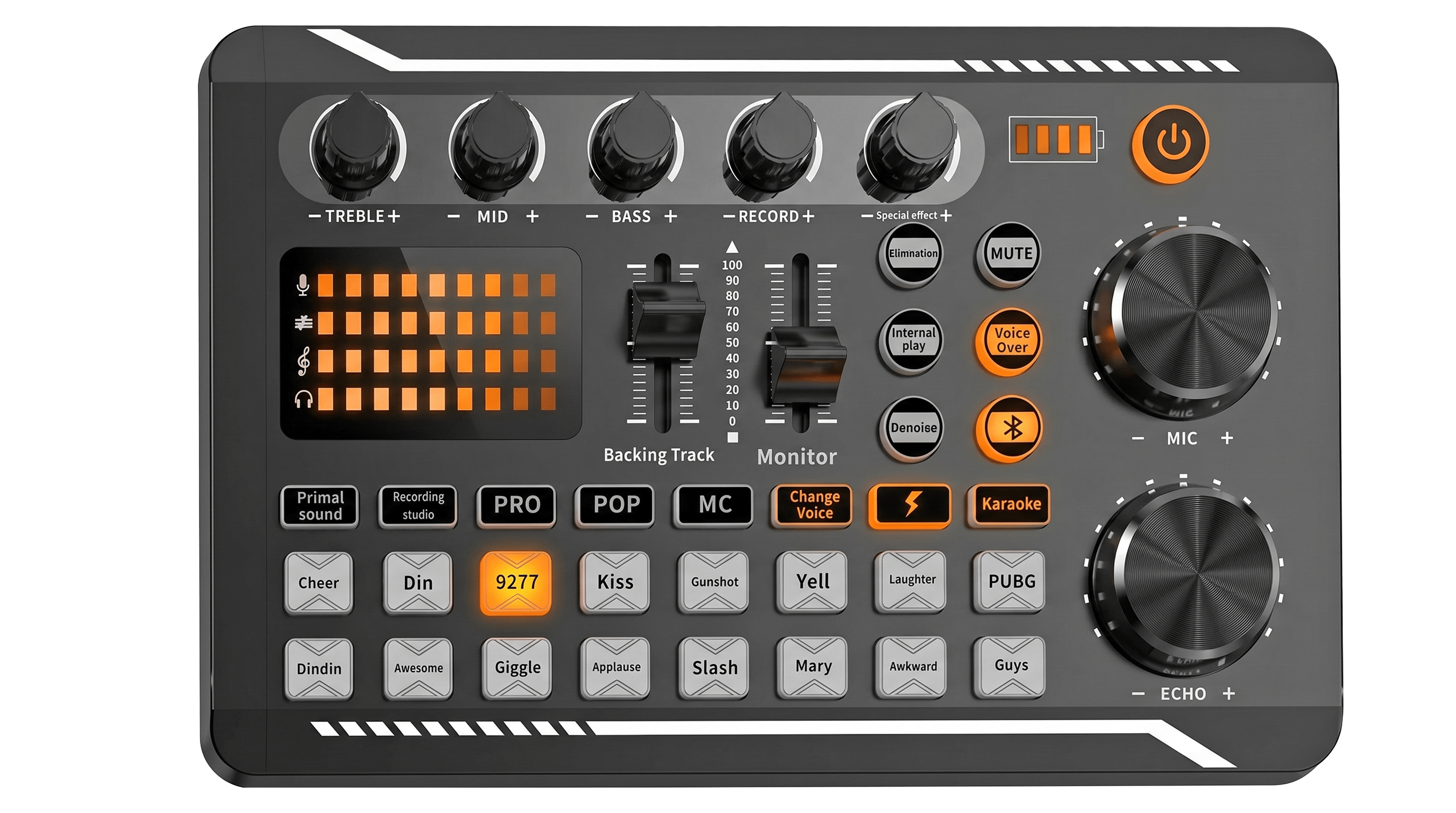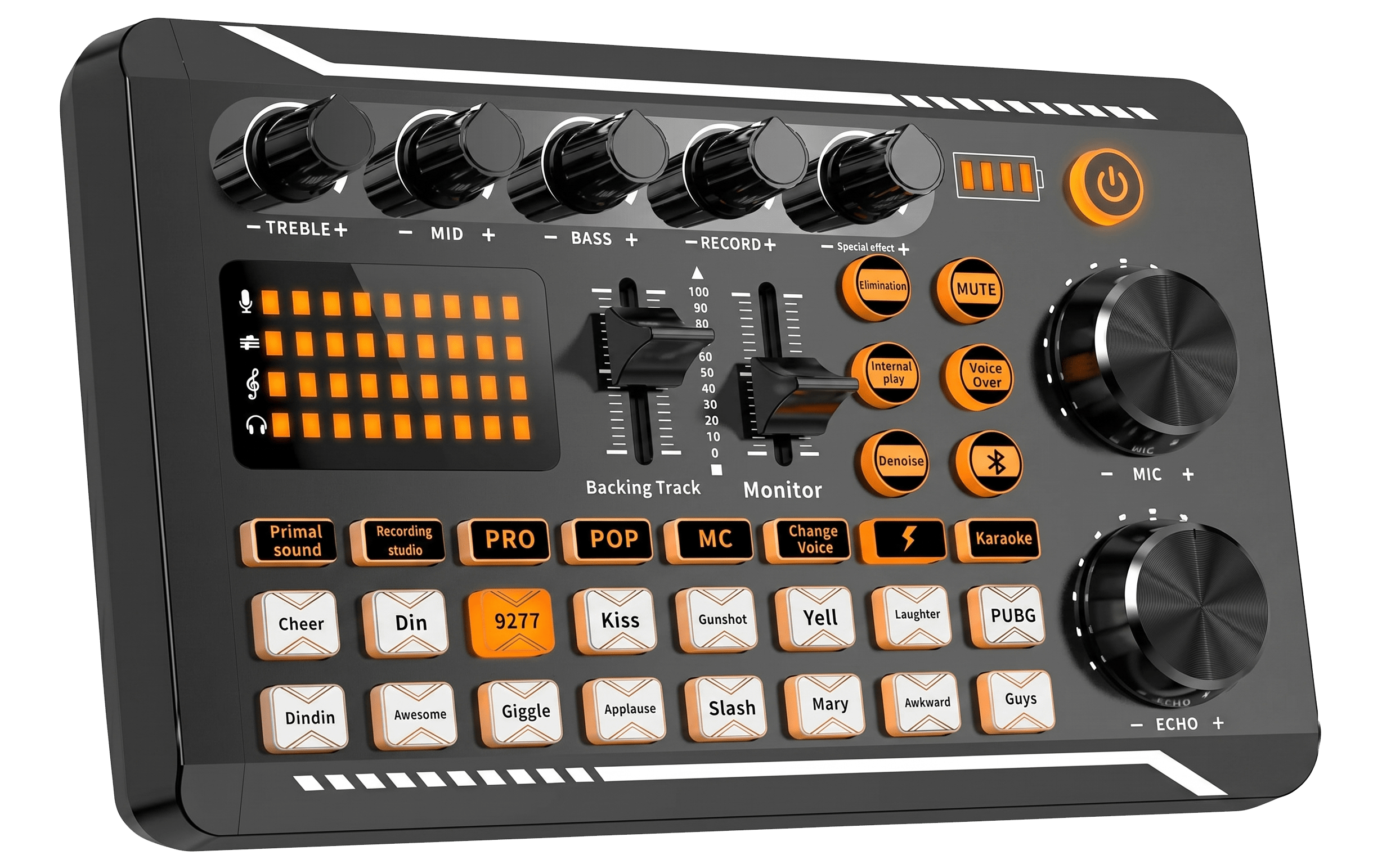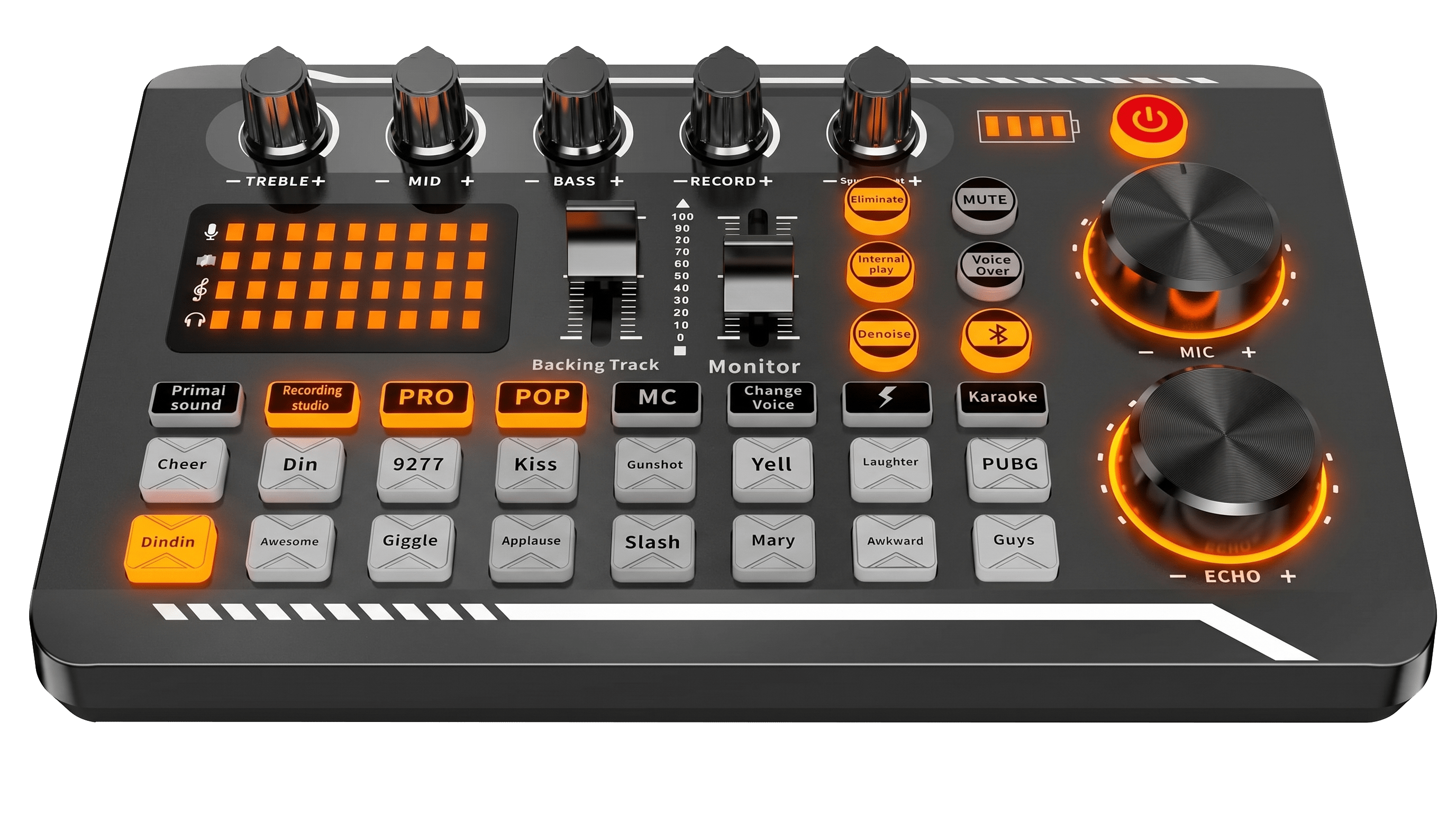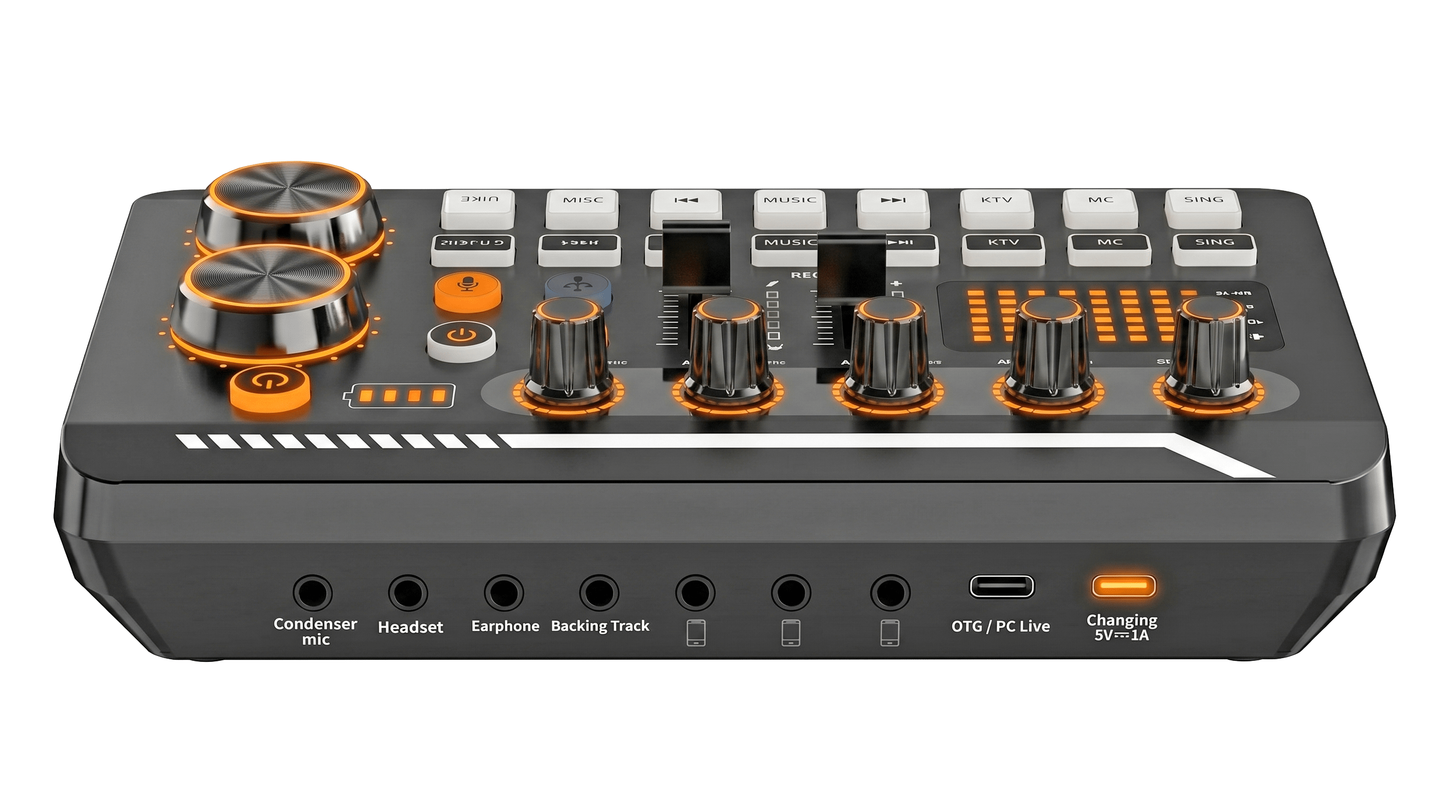 • 7 Independent volume knob adjustments and 2 fader button adjustments, covering bass, alto, treble, backing track and monitoring, etc